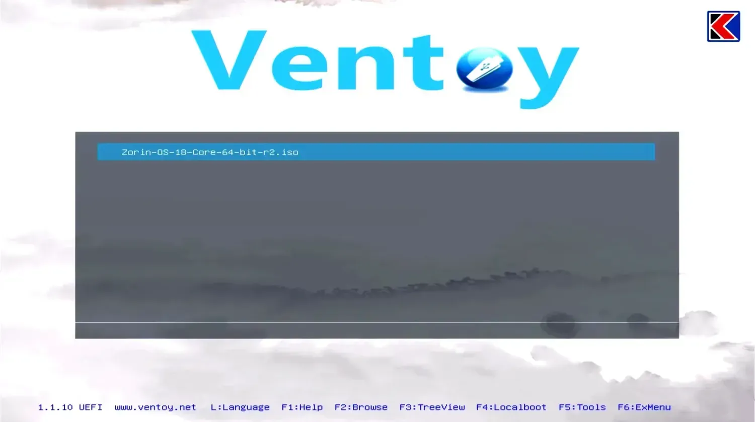 Selecciona el USB y elige la ISO de Zorin OS en el menú de Ventoy.